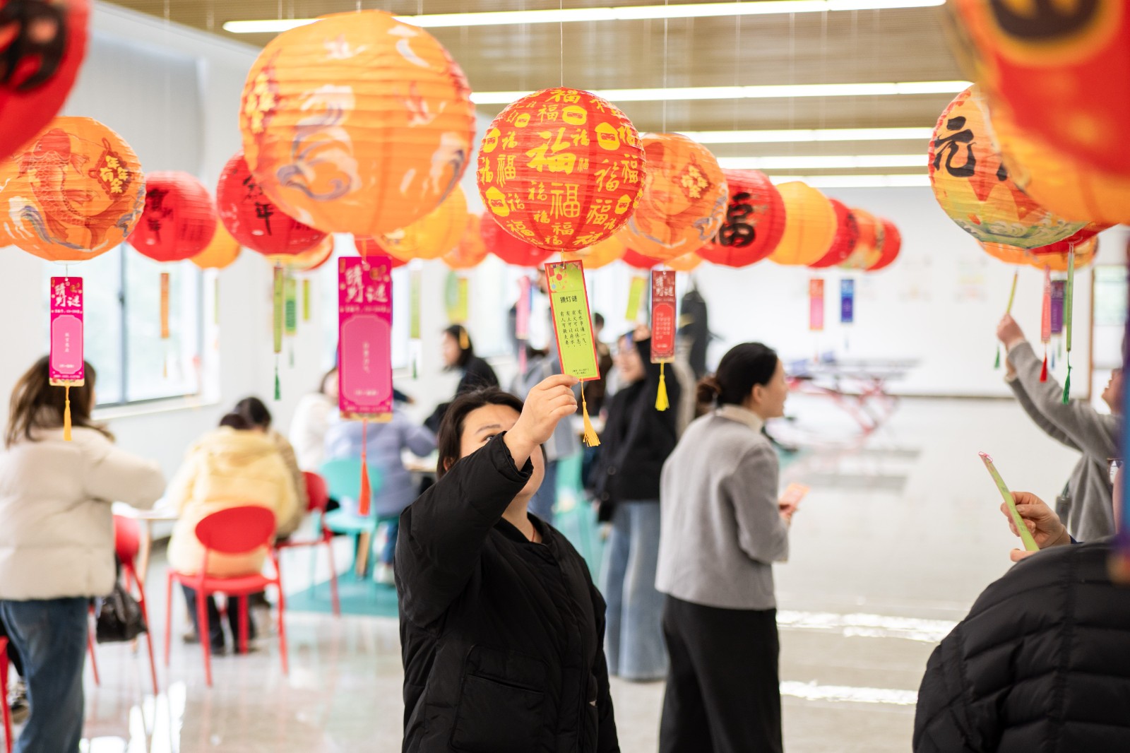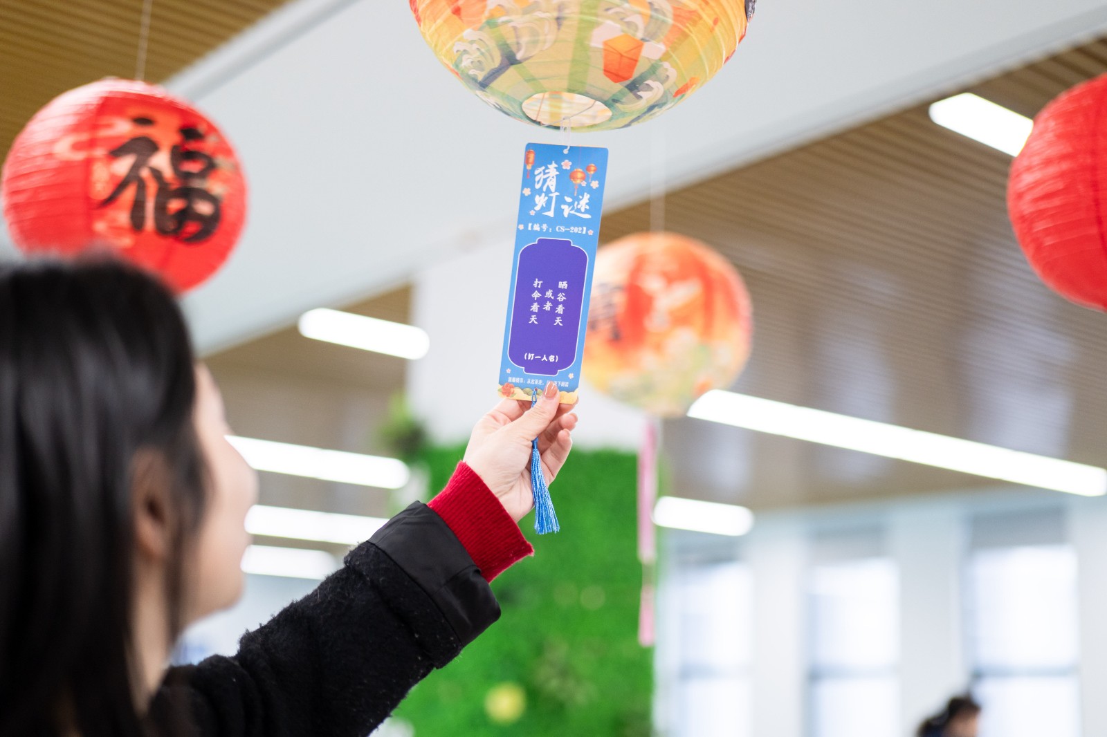 活動現(xiàn)場,紅彤彤的燈籠高高懸掛,綴滿園區(qū),福氣漫溢各處。作為上元佳節(jié)流傳千年的傳統(tǒng)雅趣,燈謎自古便有“文義隱語”之稱,是文人雅士借字傳情的智慧游戲。