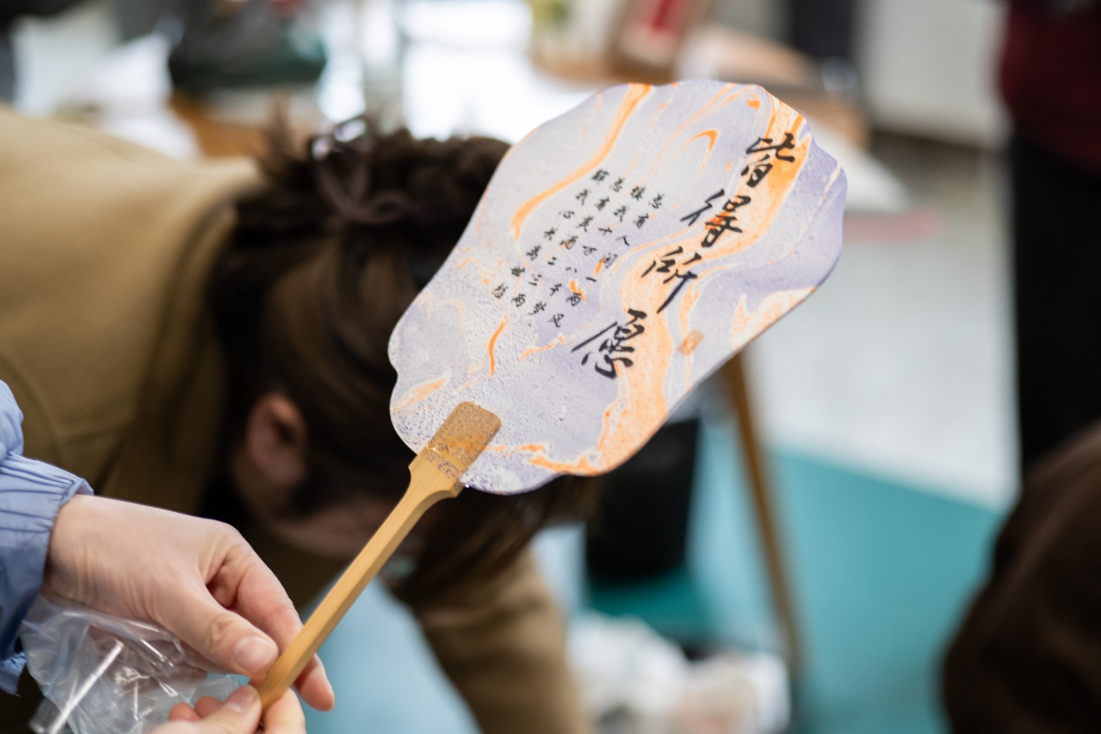不遠(yuǎn)處的非遺漆扇制作區(qū)同樣熱鬧,大家執(zhí)扇輕描、細(xì)細(xì)暈染,在指尖的流轉(zhuǎn)間,為素白的扇面添上色彩與心意,巧手之下,一把把獨(dú)具韻味的漆扇徐徐成型。